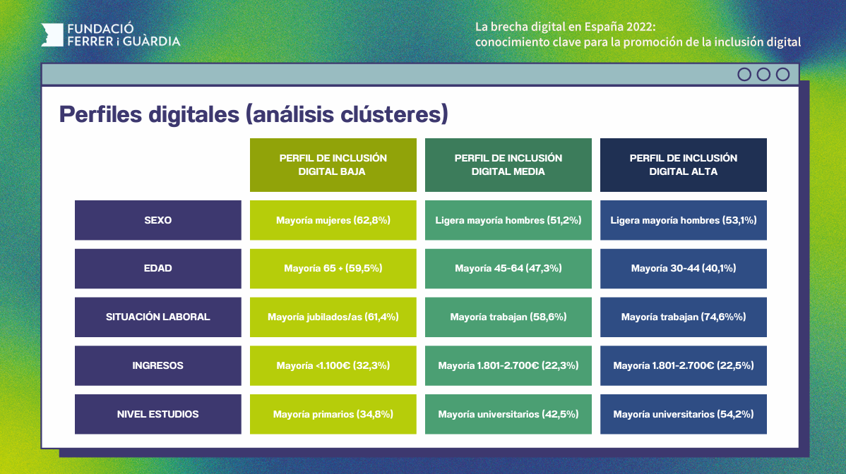 Los resultados de la Encuesta sobre Brecha digital de género de la Fundació Ferrer i Guàrdia evidencian que el perfil de inclusión digital de las personas es un factor determinante para entender la complejidad de las desigualdades sociodigitales y para predecir situaciones de exclusión, especialmente desde una perspectiva interseccional.