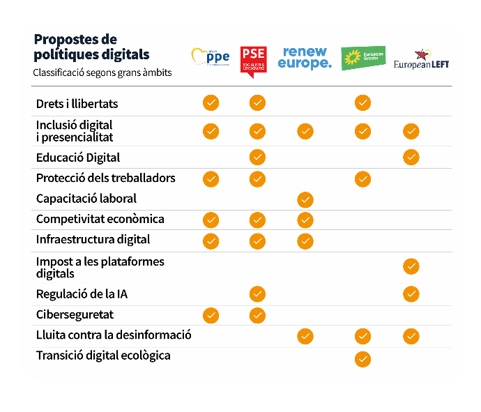 Esta tabla clasifica las principales propuestas de los partidos políticos en materia de políticas digitales por grandes ámbitos. Aunque las propuestas de los partidos se pueden englobar por áreas, hay que remarcar que la manera a partir de la cual abordan estas propuestas responde a diferentes lógicas, algunas más enfocadas a la mejora de la productividad y otras más enfocadas a fortalecer los derechos sociales.