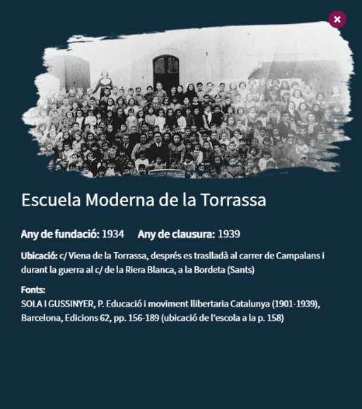 El mapa permite explorar la ubicación de las escuelas y acceder a información histórica y contextual: la cronología en la que estuvieron activas, las entidades promotoras, el profesorado o núcleo impulsor, y otros datos que se han podido reconstruir. Cuando ha sido posible, también incluye fotografías del centro y del alumnado.