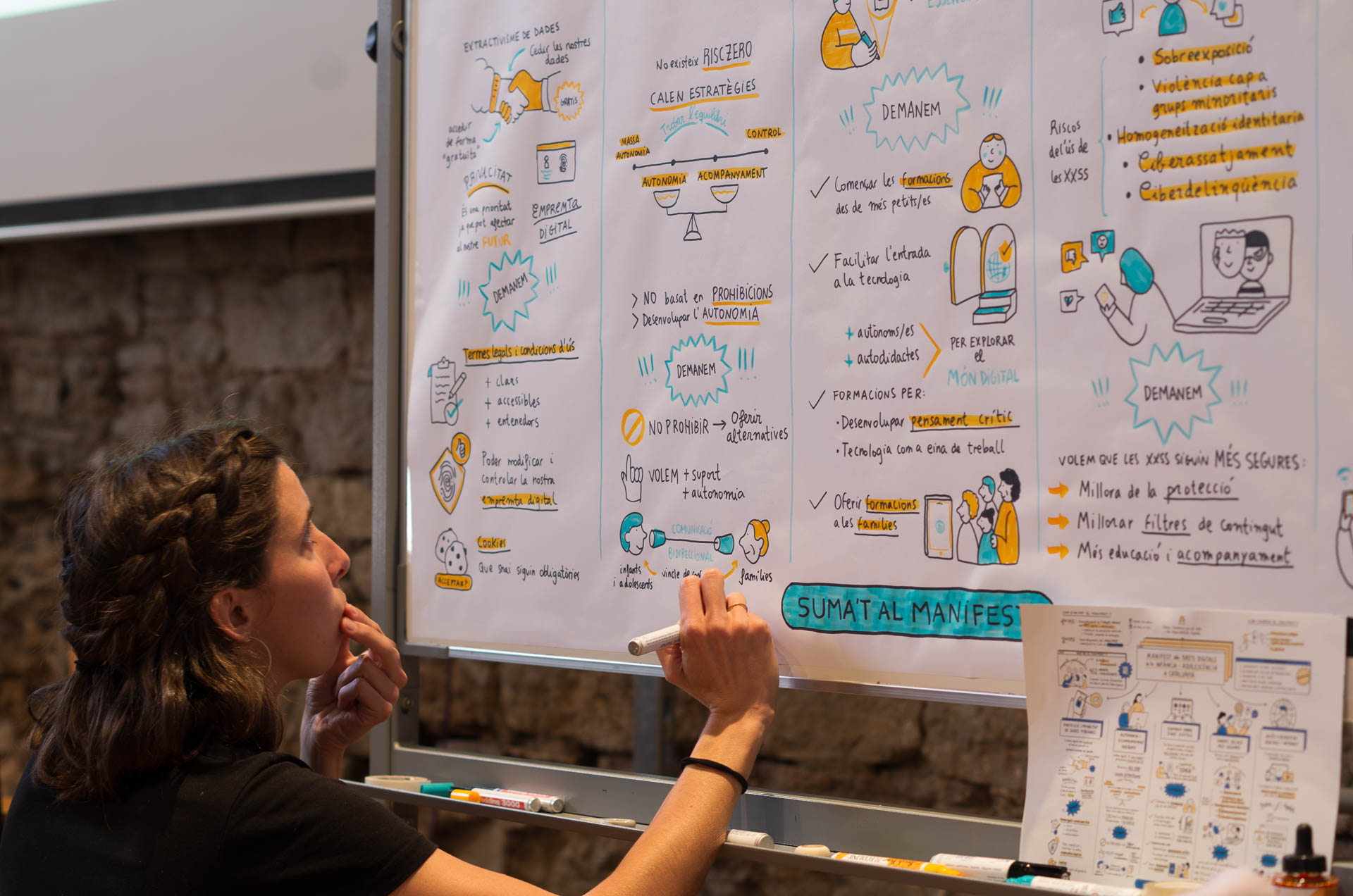 El acto se ha iniciado con una inauguración por parte de la Ingrid y Clàudia del CNIAC, seguida de una bienvenida institucional a cargo de la directora general de Sociedad Digital de la Generalitat de Cataluña, Liliana Arroyo Moliner. A continuación, Maria Padró-Solanet de la Fundación Ferrer i Guàrdia, acompañada de la Rim y la Eraide del CNIAC, han presentado el proceso participativo de construcción del Manifiesto y organización del acto. Acto seguido, el Andrea del CNIAC y la Lucia, el Helena, el Lluc F. y el Lluc C. del IE Costa i Llobera han leído el Manifiesto, acompañados y acompañadas por el Visual Thinking de la ilustradora Eva Palomar. Finalmente, el Roger y el Teo del IE Costa i Llobera han moderado mesa redonda de personas expertas en la que han participado la Judith Jacovkis, profesora del Departamento de Didáctica y Organización Educativa de la UB, Genís Margarit, experto en Ingeniería de Telecomunicaciones y Ciberseguridad de la UPF y la propia Liliana Arroyo. Tanto el proyecto participativo como el acto de presentación del manifiesto han sido impulsados por la Dirección General de Sociedad Digital del Departamento de Empresa y Trabajo de la Generalidad de Cataluña, en colaboración con la Fundación Ferrer i Guàrdia y el apoyo de la Red Punto TIC.