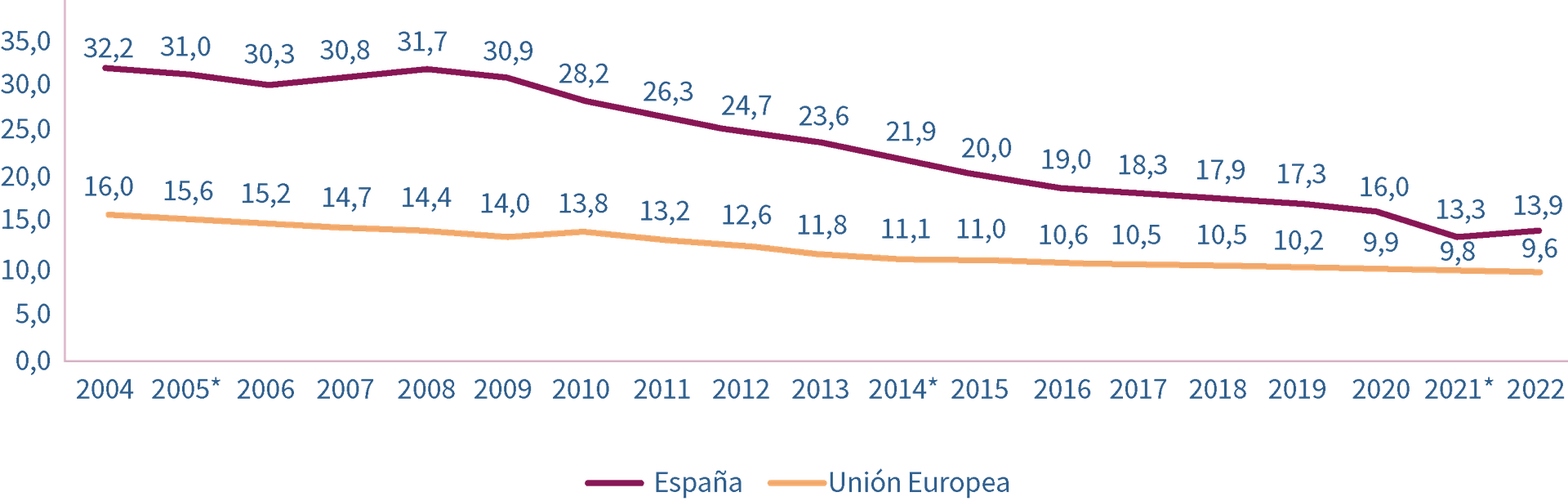 Font: Encuesta Europea de Fuerza de Trabajo (LFS), EUROSTAT.  (*) Ruptura de sèrie.